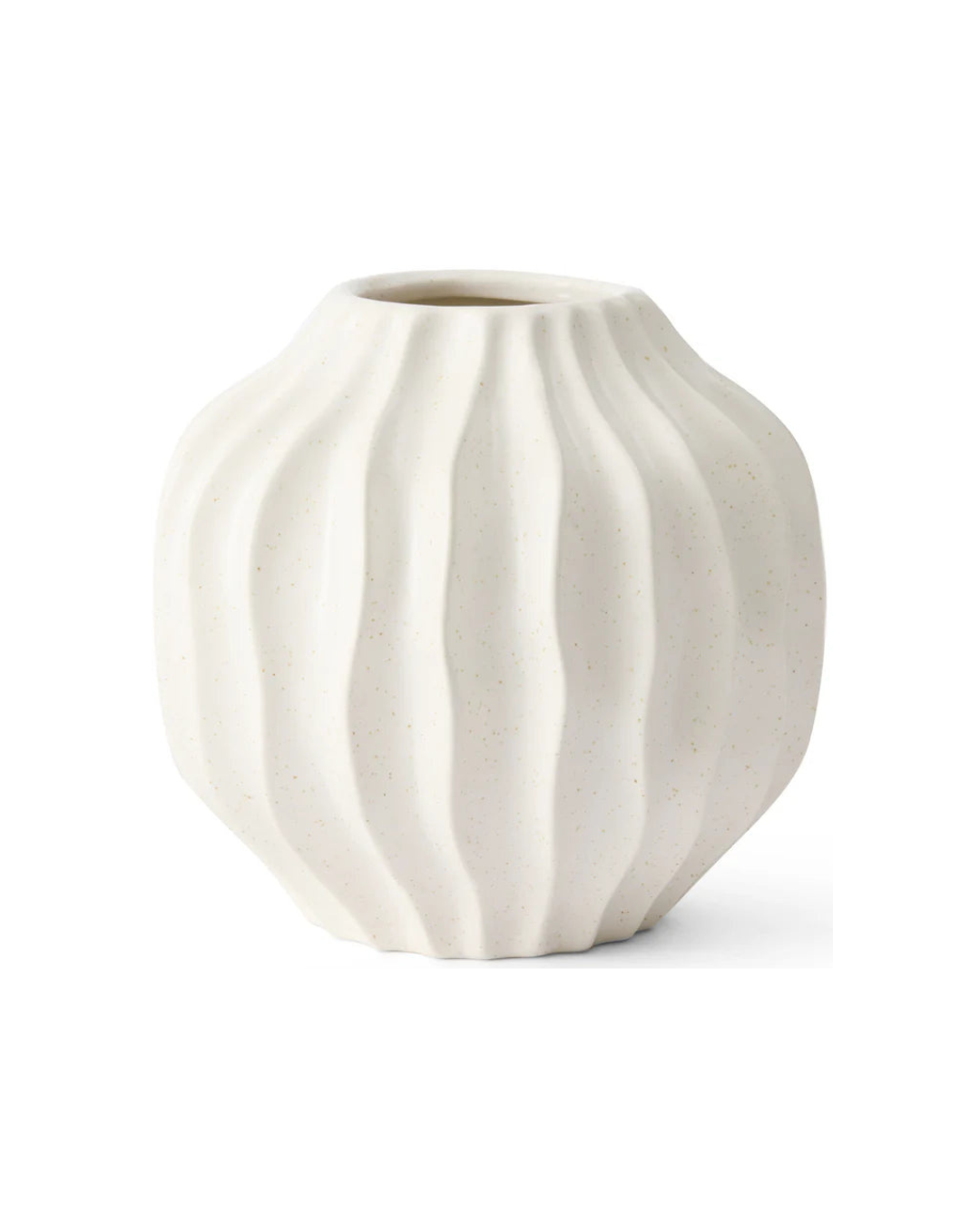 The Crevice Speckle Vase is made from ceramic with a white matte speckled finish. Its wavy, rippled surface adds texture and works well on its own or with foliage.