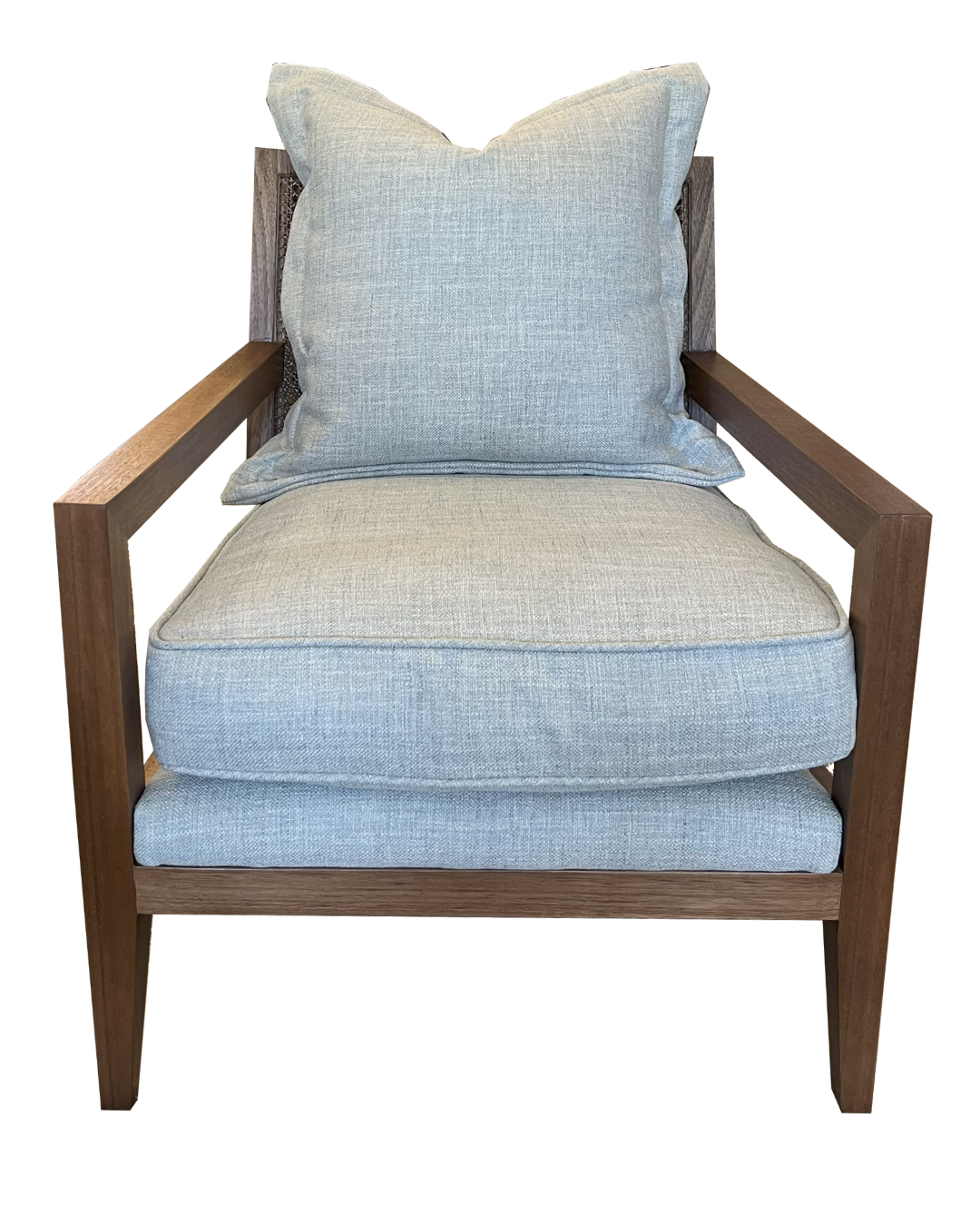 The Valentino Chair by Molmic features a walnut timber frame and rattan back, featuring a separate back cushion. The custom duck egg blue fabric adds a timeless and elegant touch to any space.